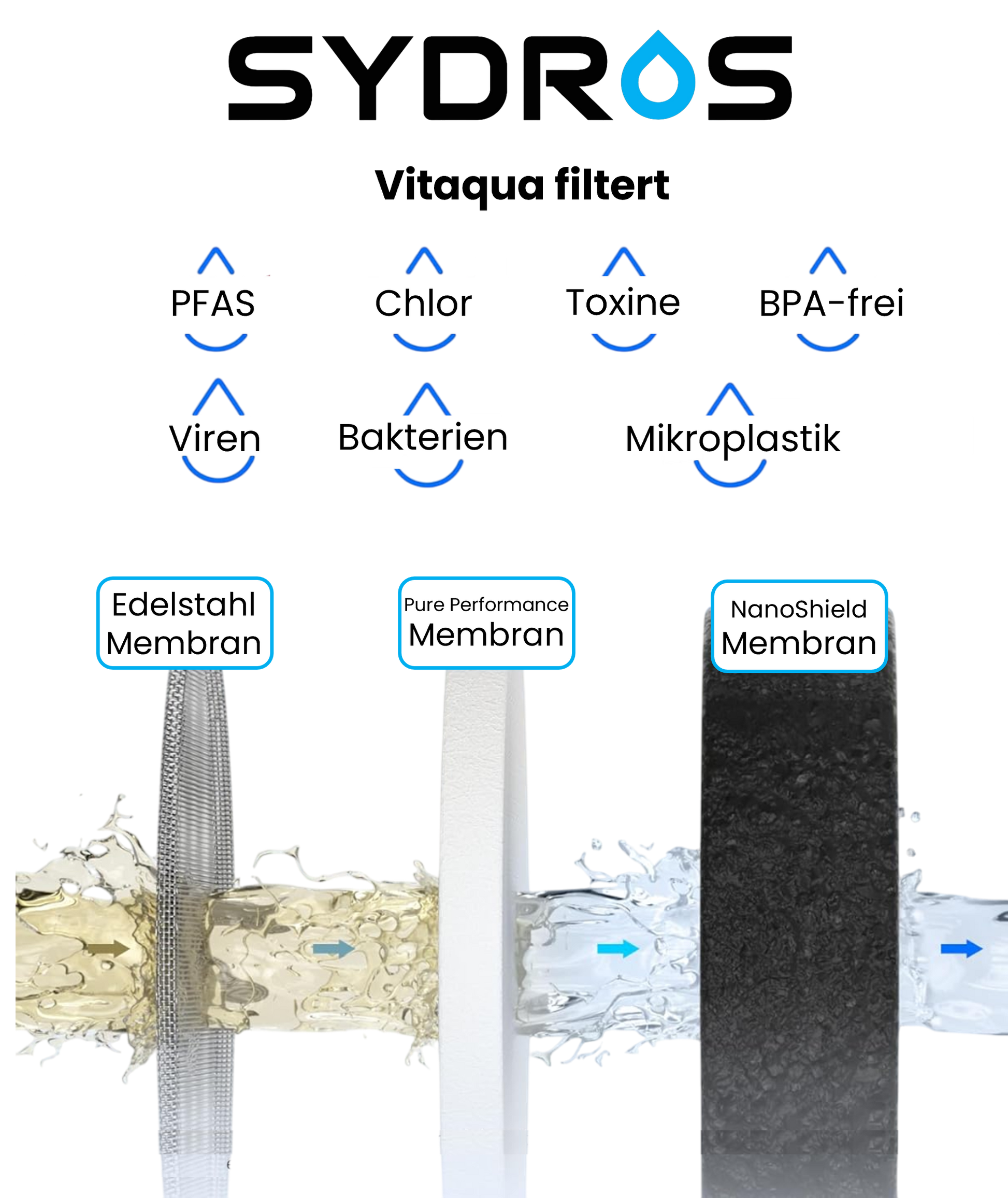 Mit dem SYDROS Vitaqua erhältst du jederzeit sicheres, geschmacklich sauberes Wasser – ganz ohne technische Hürden. Ideal für Familien, Singles, Reisende & Camper. Einfach montieren. Sofort genießen.